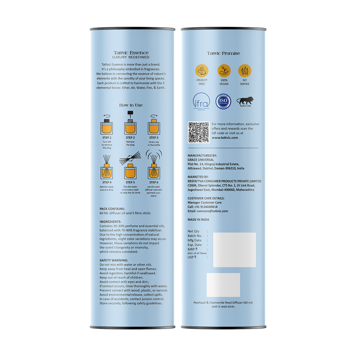 Product DescriptionReconnect with the calming wisdom of nature through the Tattvic Essence Patchouli & Chamomile Reed Diffuser Set — a grounding blend rooted in the essence of the Earth element. Deep, herbaceous patchouli combines with the gentle, floral calm of chamomile to create a meditative aroma that invites stillness, emotional healing, and inner balance.